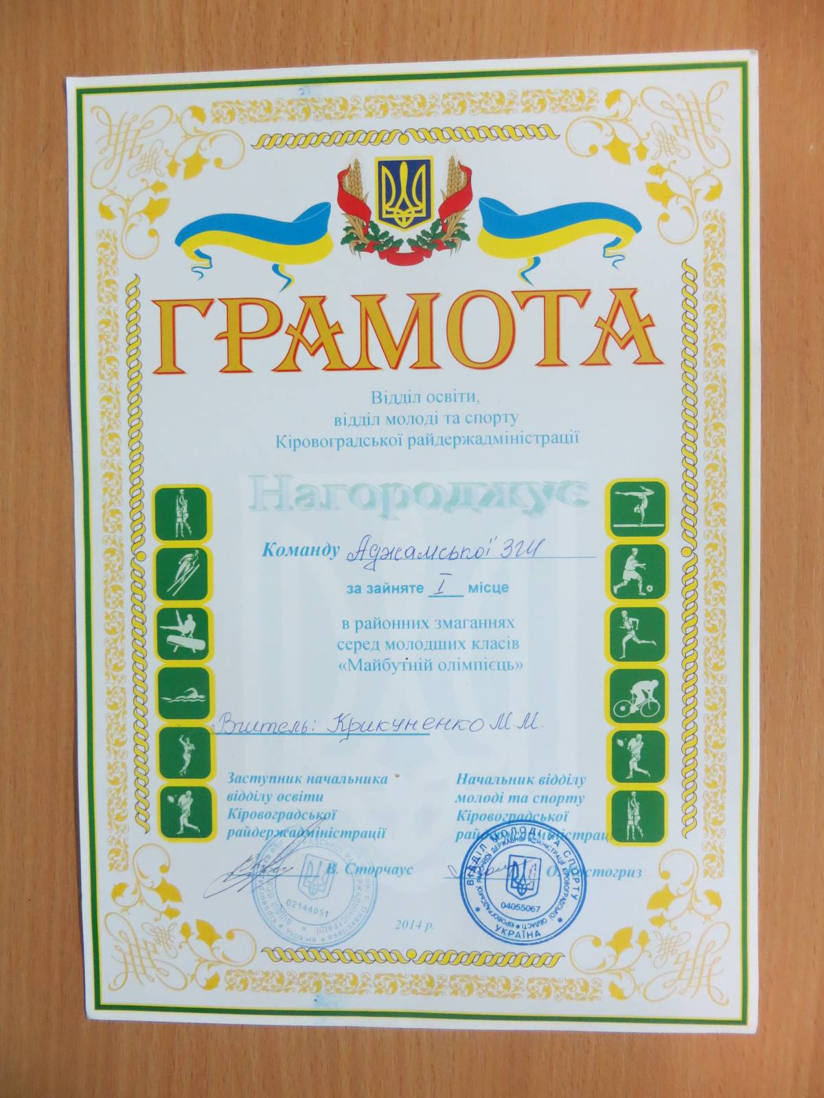19.11.2014р. відбулися районні спортивні змагання "Майбутній олімпієць" серед учнів 2-4 класів Команда Аджамської ЗШ виборола перемогу, зайнявши І місце. Вчитель - Крикуненко Марина Миколаївна Учасники команди: Кирик Євгеній, Левицька Катерина, Кухта Максим, Маленкова Анна.